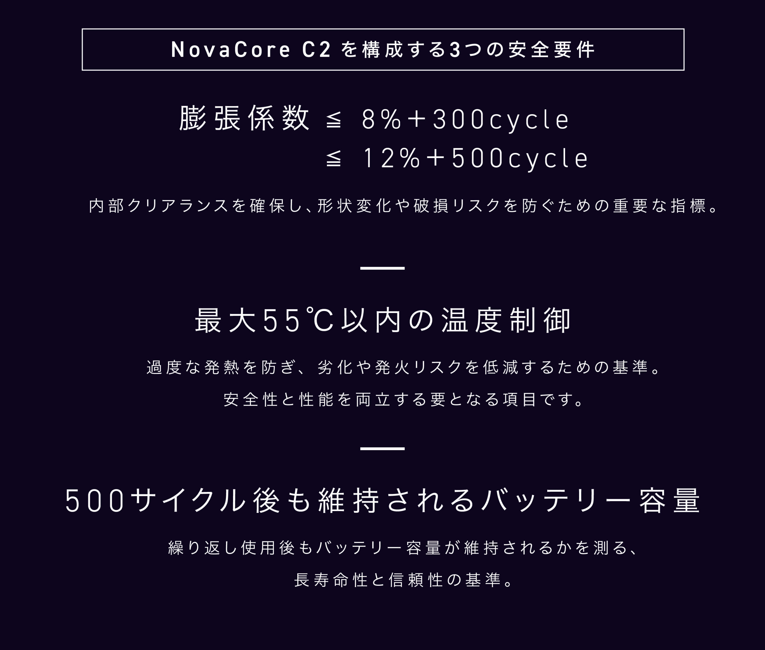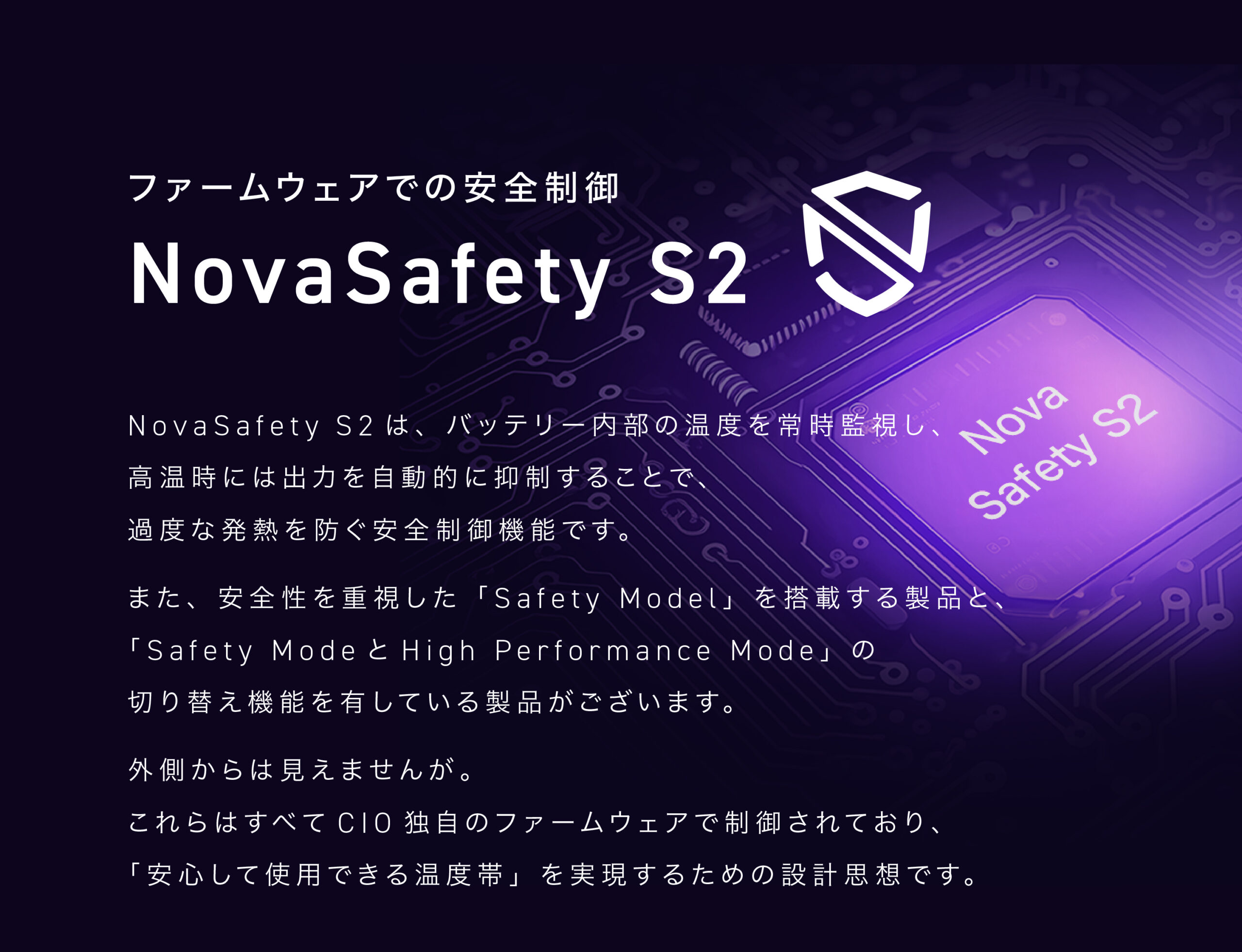 発火リスクの低減を目指し、CIOでは、NovaCore(ハードウェアでの安全設計)と NovaSafety(ソフトウェアでの安全制御)を組み合わせることで、より安全性を高め、 万が一のリスクを可能な限り低減する取り組みを行っております。