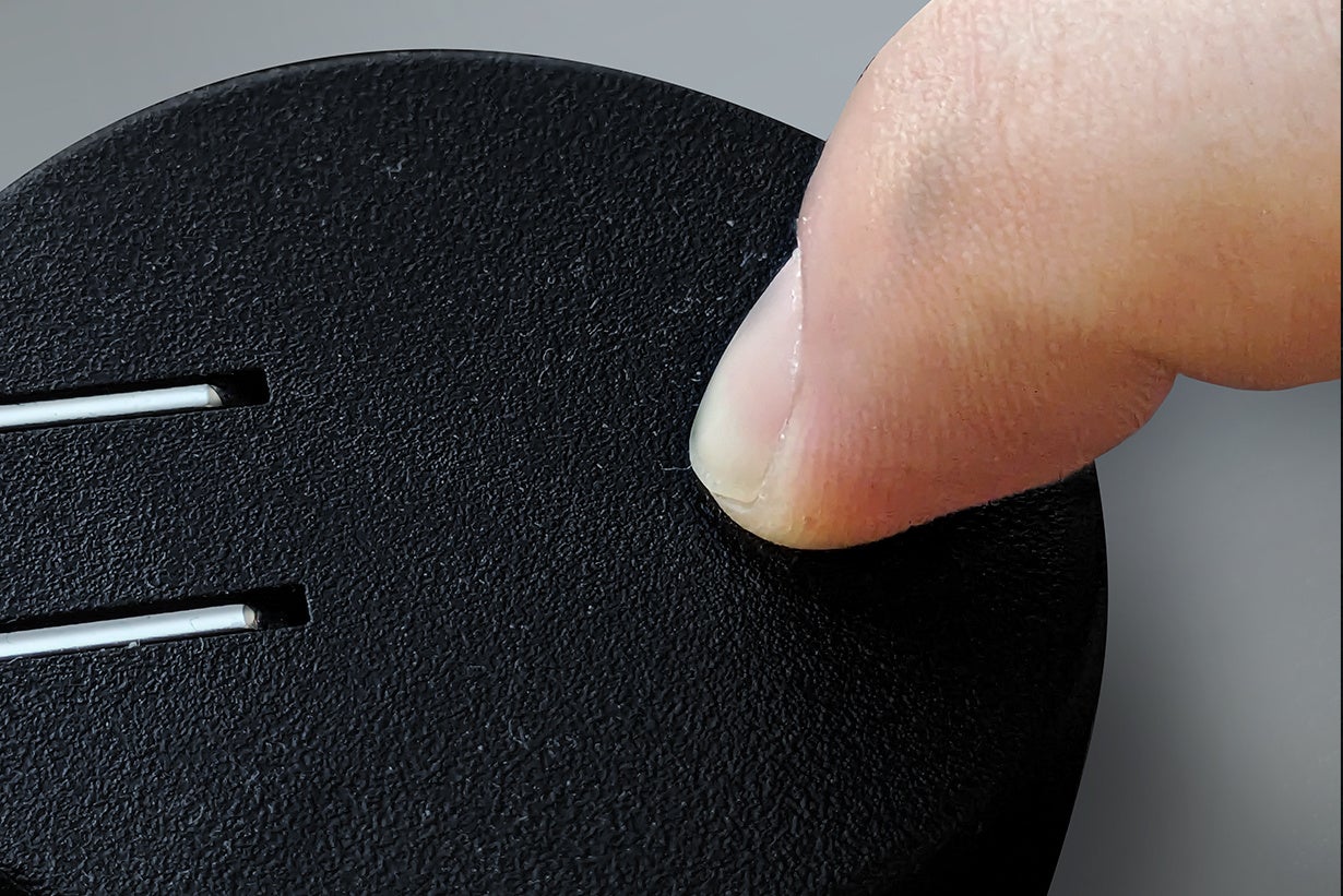 正面のワイヤレス充電面にはスマートフォンへの傷つけ防止の観点から、エラストマー素材を採用しています。