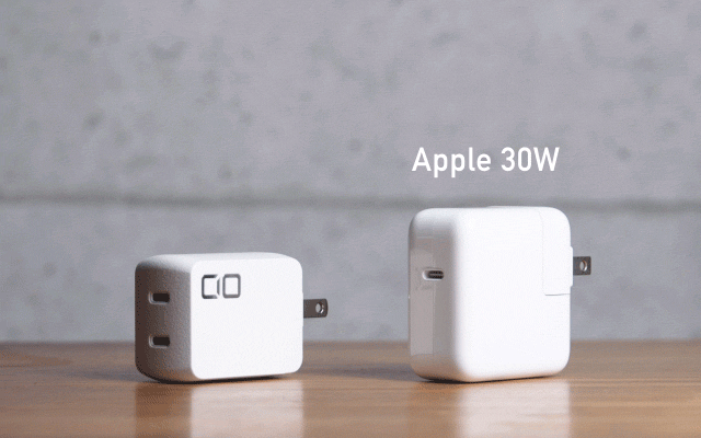 Apple純正30W充電器と比較し、ポート数・出力共に2倍にも関わらず圧倒的な体積比と小ささを実現しています。