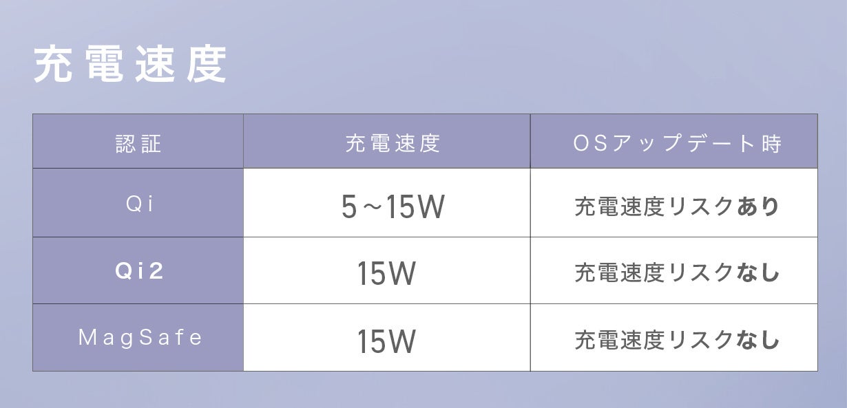 なおQi2規格はApple純正のMag Safe規格準拠のため、今後iOSがアップデートされても安心してお使いいただけます。