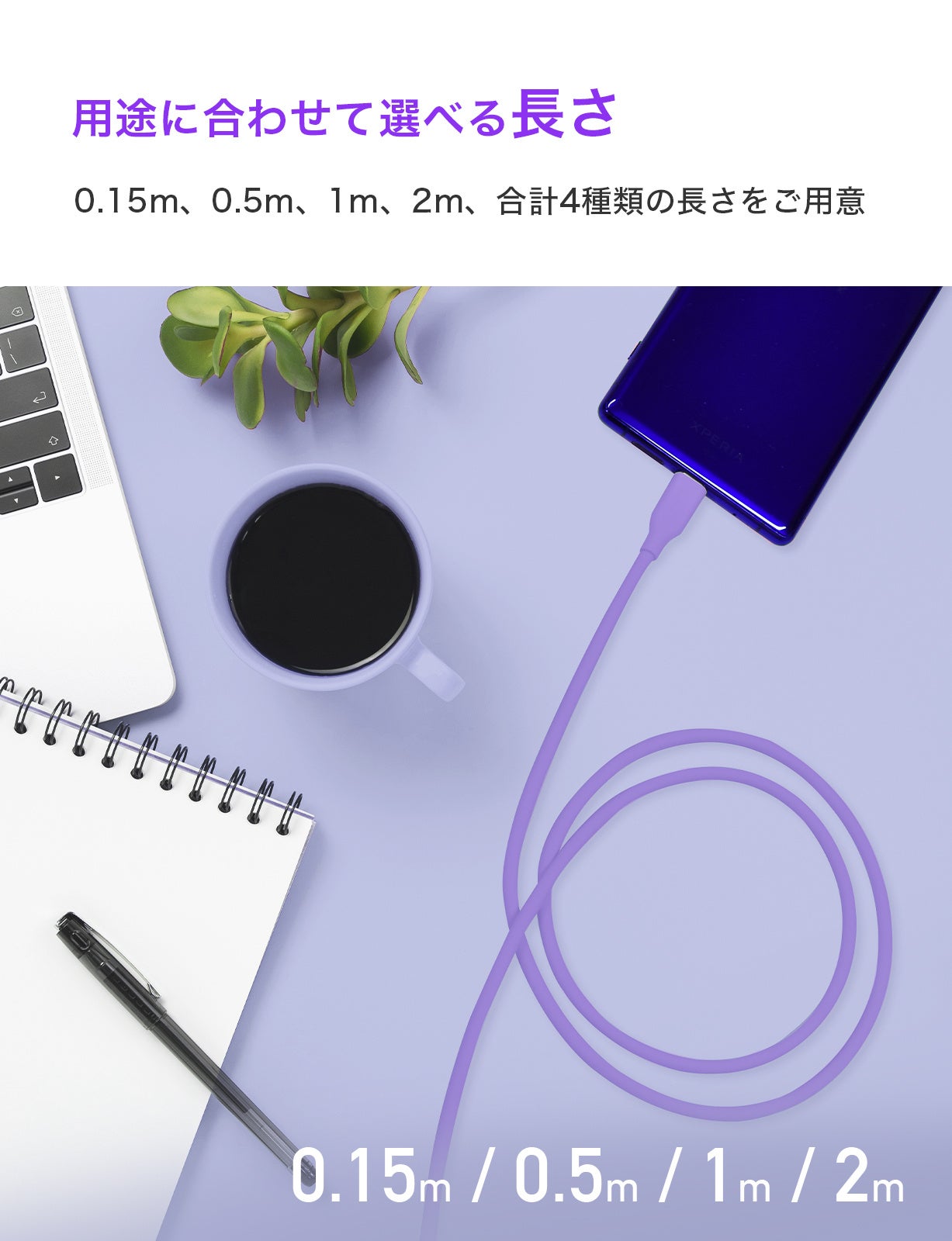 ケーブル被覆に柔軟性のあるシリコン素材を採用。しなやかで絡みづらいので使い心地・収納性にも優れます。心地よい肌触りで癖がつきにくいので、各デバイスの充電時ケーブルの取り回しに便利です。