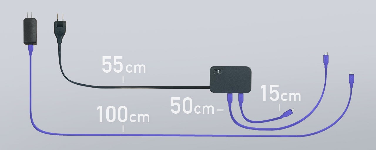55cmの電源ケーブルは、USB充電器を内蔵した本体を55cm手元に近づけてくれる効果があります。そのため、50cmのUSBケーブルでも実質100cmのケーブルと同等に使えるようになります。
