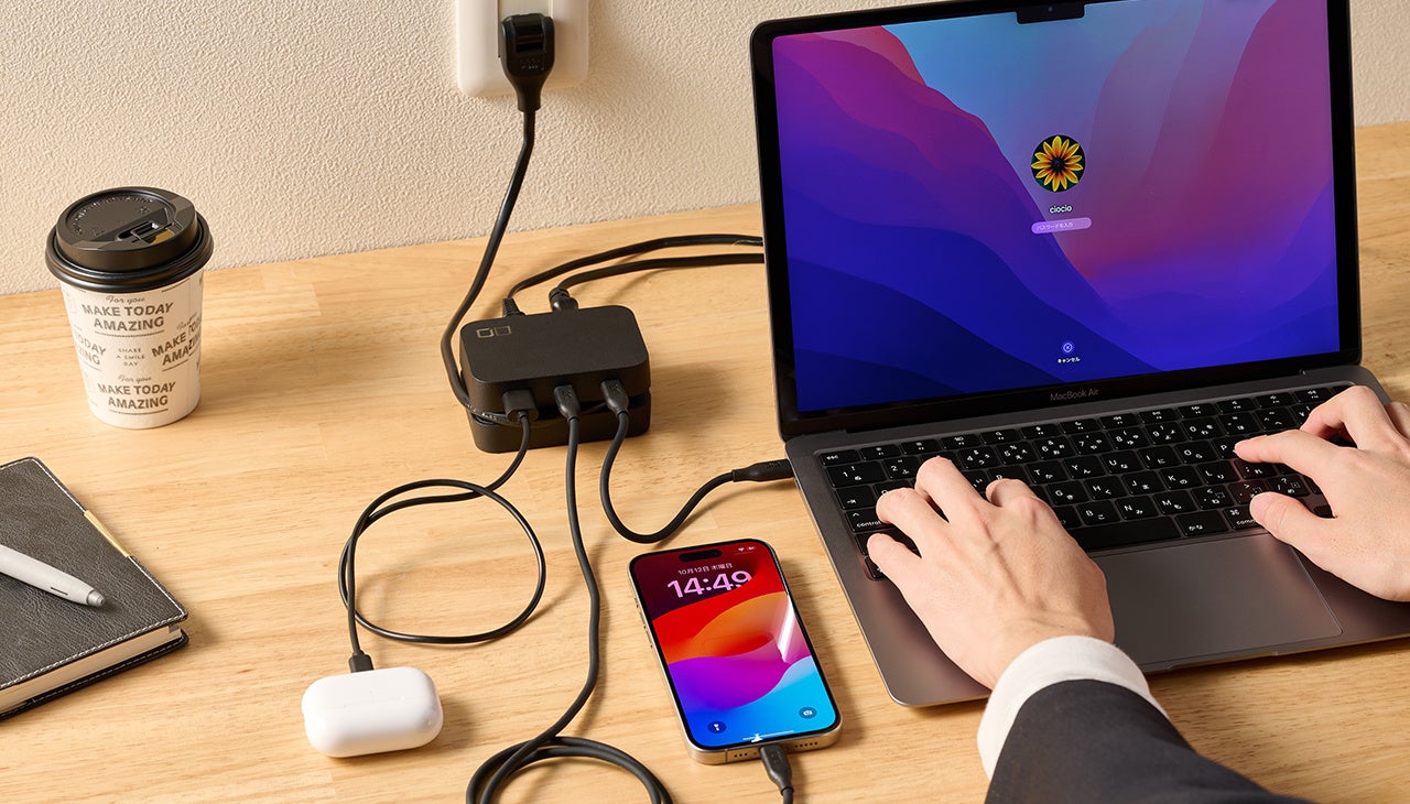 次世代半導体GaNを採用したUSB充電器機能は単ポート最大67W、3ポート合計60Wの高出力を実現。ノートPCをはじめ、スマホやデジタル一眼レフカメラなど多くのUSB充電機器に給電が可能。個々に専用充電器を持ち出す必要が無くなります。