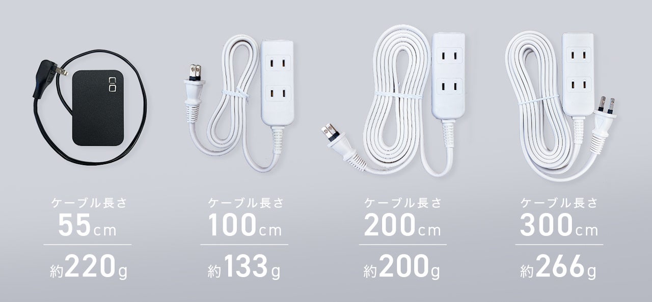 電源ケーブルの長さは、長くするほど重くなり体積も増えます。これは電源ケーブルの長さだけが違う3種類の電源タップを見ていただければ明らかです。Polaris CUBE Built in Cableは電源ケーブルを55cmに収めたからこそ、このコンパクトさを実現できました。