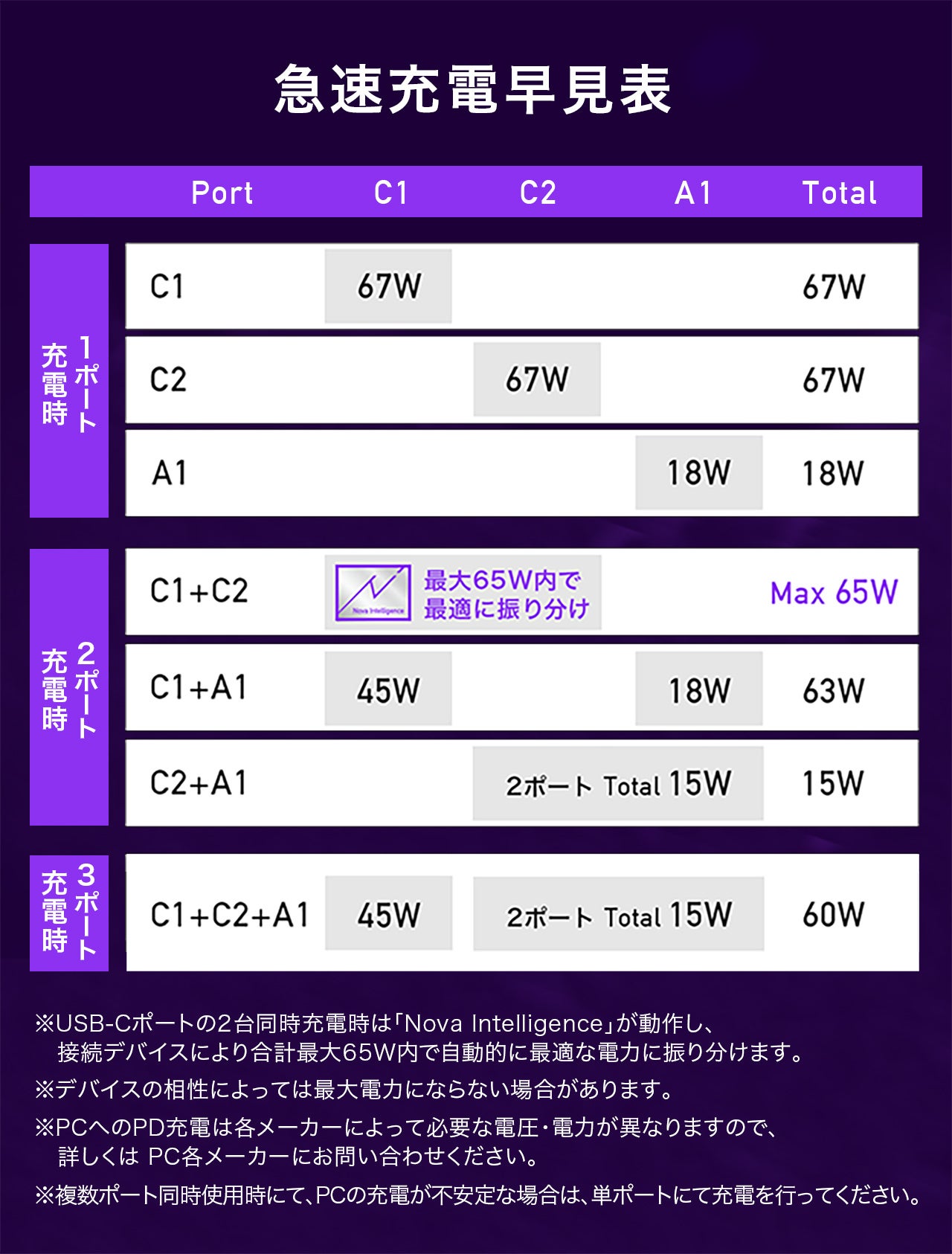従来の複数ポート充電器の場合、ポートによって出力が固定化されたものが多く、ポートを挿し間違えると低速充電になったり、PCの場合充電出来なくなる事も・・・