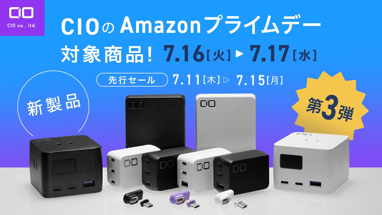 ⼩型・⾼出⼒のモバイルバッテリー「SMARTCOBY」シリーズや、⼩型のGaN急速充電器「NovaPort」 シリーズなどの各種充電機器を展開する株式会社CIOは、2024年度Amazonプライムデーに向け、同社主⼒をAmazon プライムデー特別価格にて販売いたします。