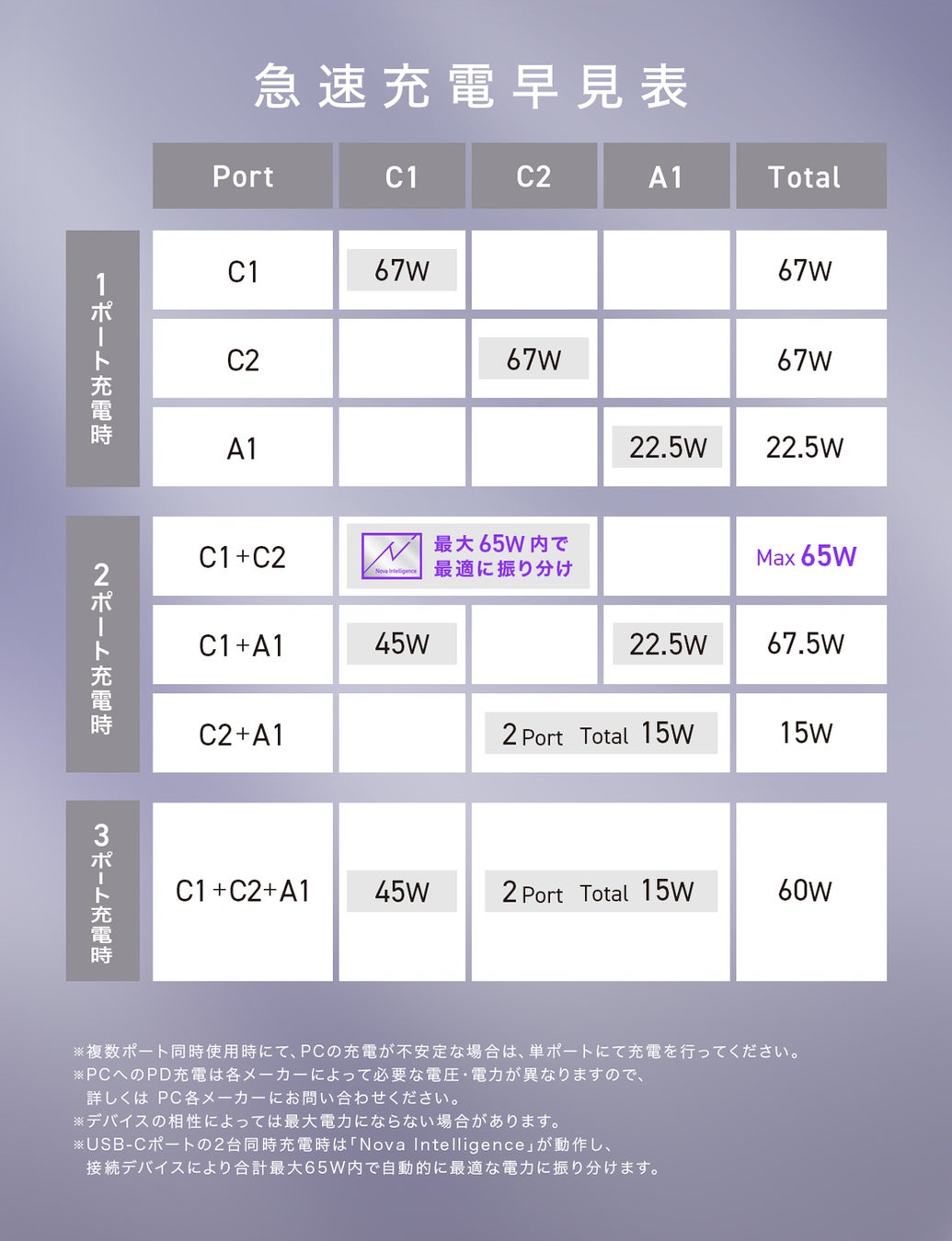 ポートを選ばないだけでなく、振り分けもデバイスに合わせ自由自在。お持ちのデバイスに合った振り分けを自動で調節するので、ポートの振り分けW数のパターンを見て充電をする必要がありません。