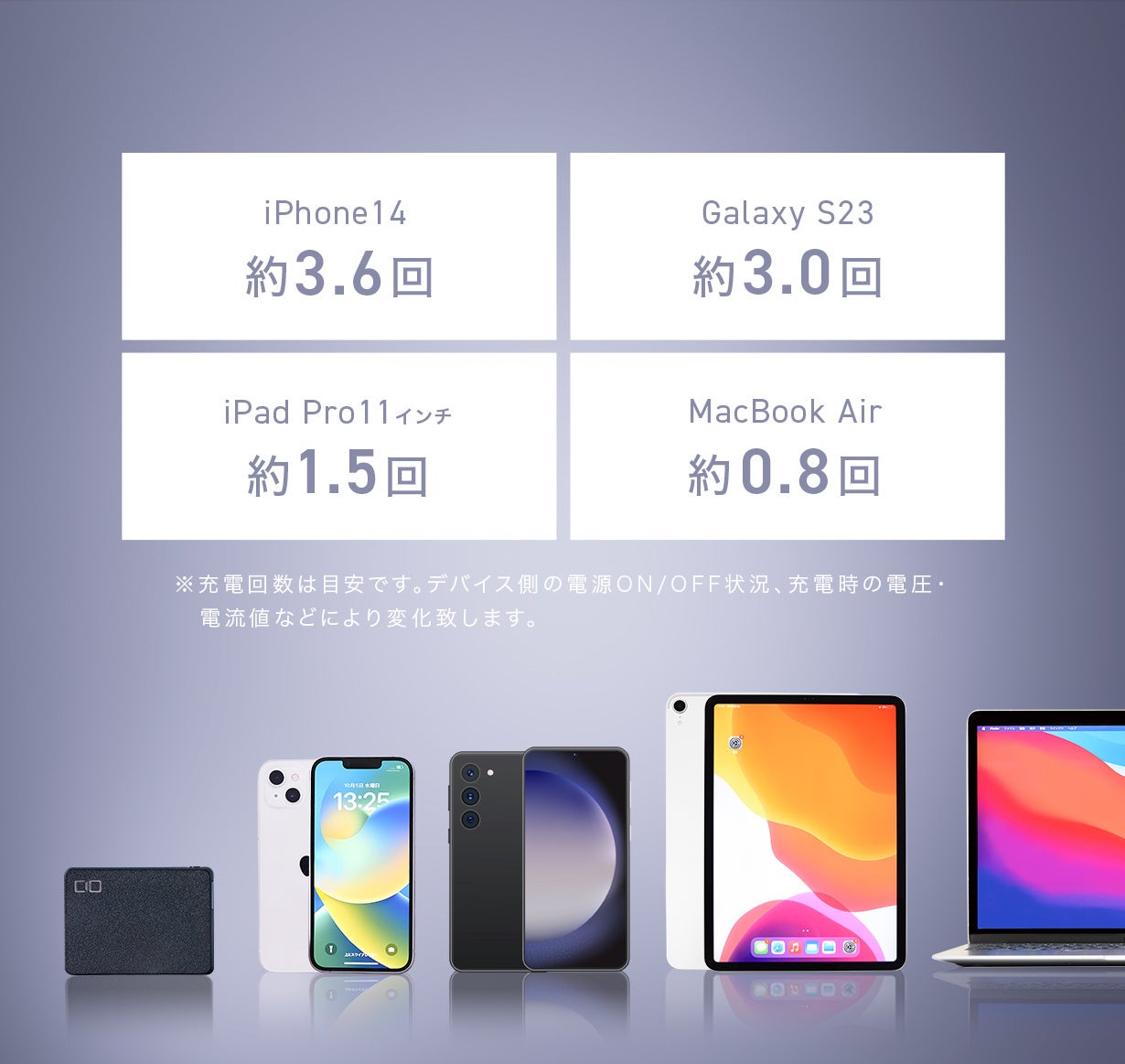 イヤホンやスマートウォッチなどのスモールデバイスやスマートフォン、タブレットへの充電はもちろん、MacBookやWindowsノートPCへも最大出力で充電が可能です。