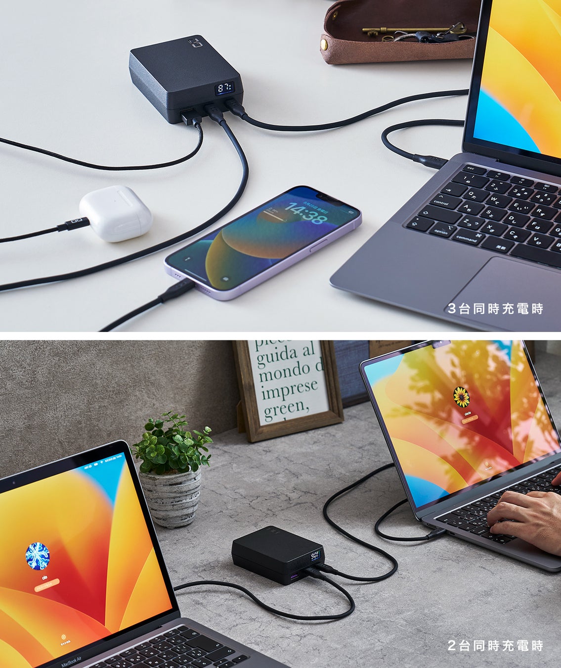 SMARTCOBY TRIOはCポートを2つ、Aポートを1つ備えており、3台同時充電に対応。スマホ+ノートPCはもちろんのこと、ノートPCの2台同時充電も可能です。