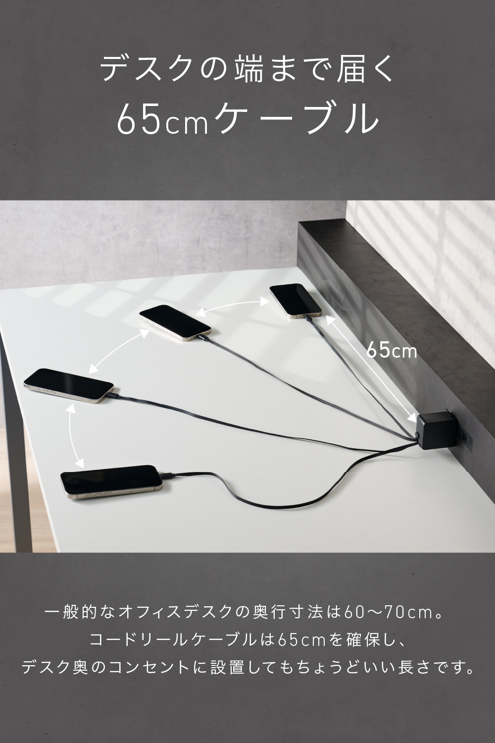本体に最長65cmのUSB-Cケーブルを内蔵。ボタンを押すと端子が飛び出し、必要な長さで調整して使用可能です。ケーブルは引き出した後に自動で巻き取られ、デスクや持ち運びでも常にスッキリとした環境を保てます。
