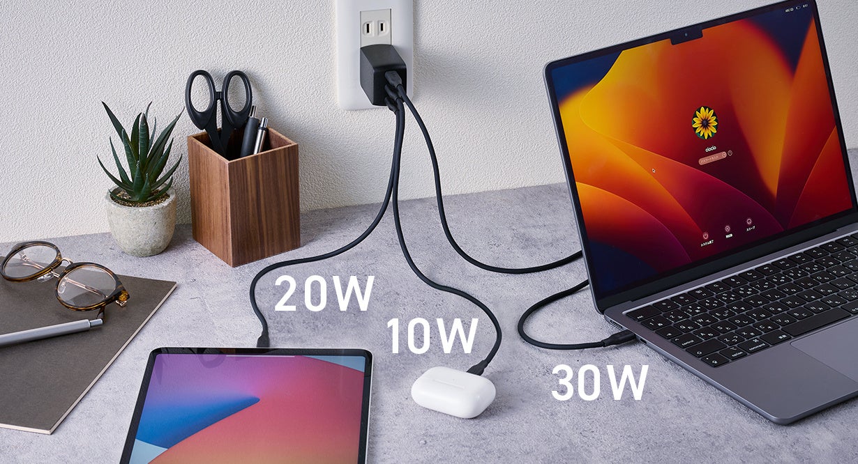 ビジネスシーンにおいて、PC+モバイルバッテリー+イヤホンや、PC+スマホ+イヤホンといった組み合わせの充電時に活躍します。