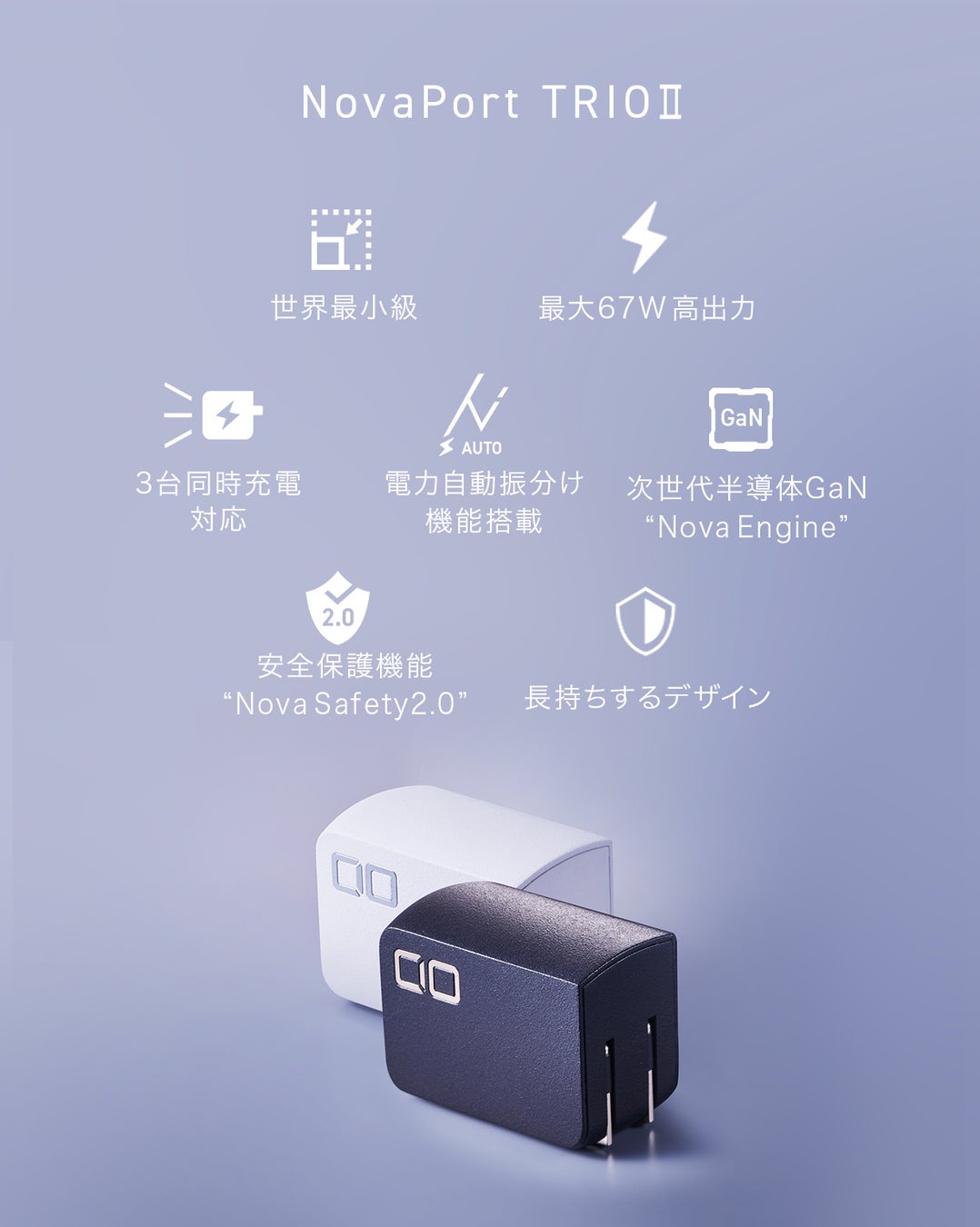 - 『スマホもPCもコレ1台!67W対応世界最小級充電器”NovaPort TRIOⅡ”』