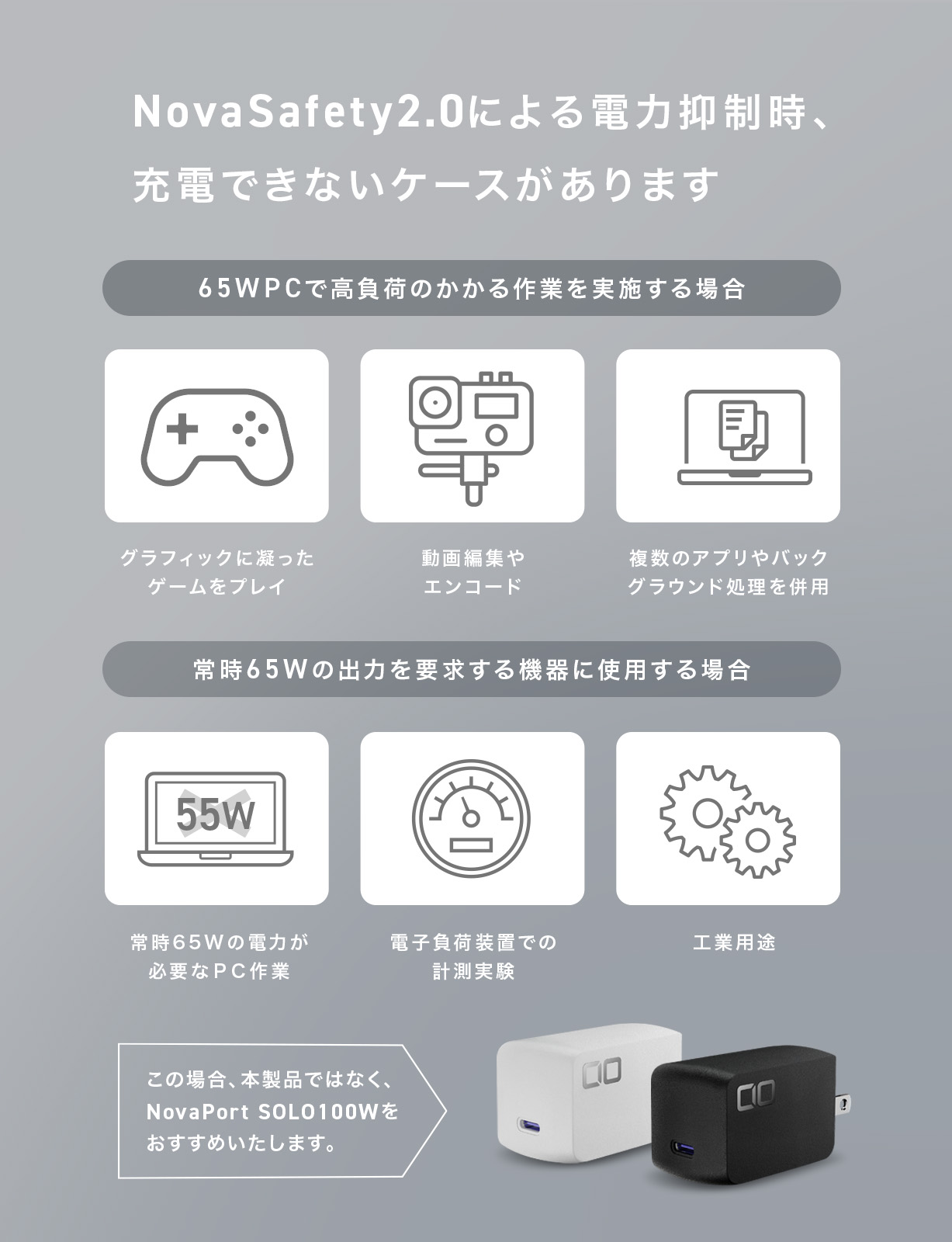 一方で、電子負荷装置や工業用途など、常時65Wフルパワーで連続出力を必要とする特殊な使用環境では、安全保護機能により出力が制御される場合があります。