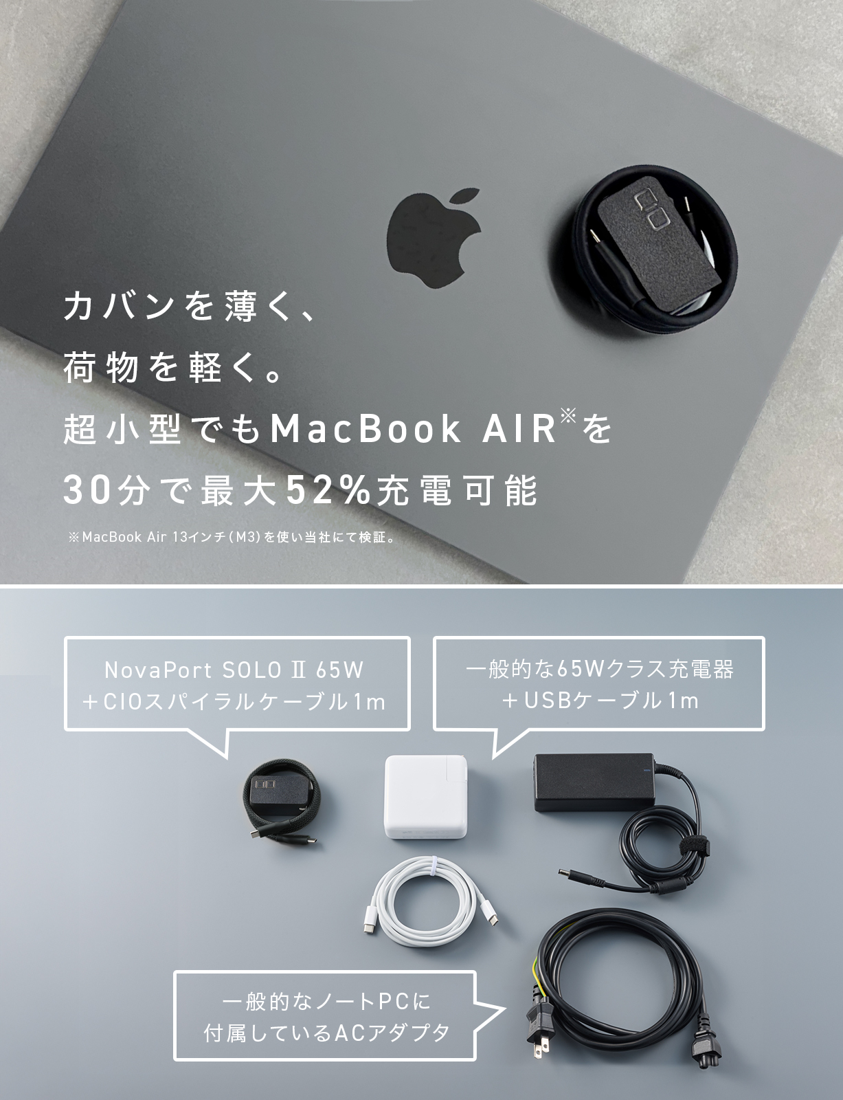 GaN(窒化ガリウム)テクノロジーを採用し極限まで小型化しつつ発熱を抑え、最大出力65WでPC充電にも対応! MacBook Proだけでなく、PD対応の様々なWindowsノートPCにも充電可能。 スマートフォンからノートPCまで幅広い機器に対応しています。 デバイス毎に異なる充電器を持ち運ぶ必要はありません。