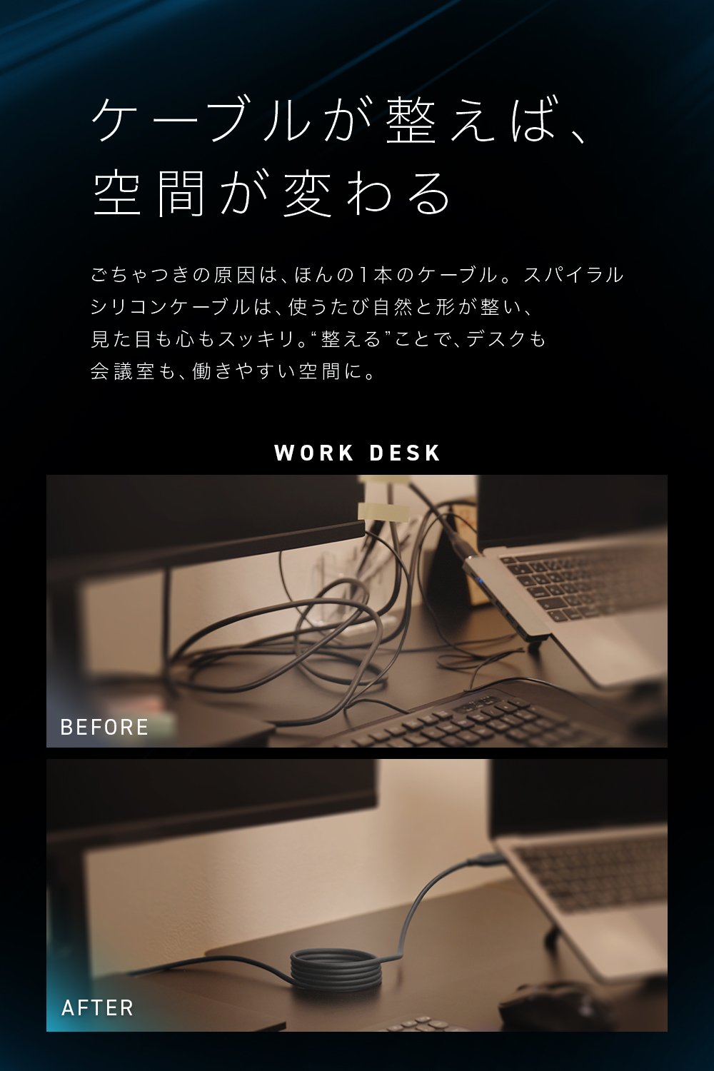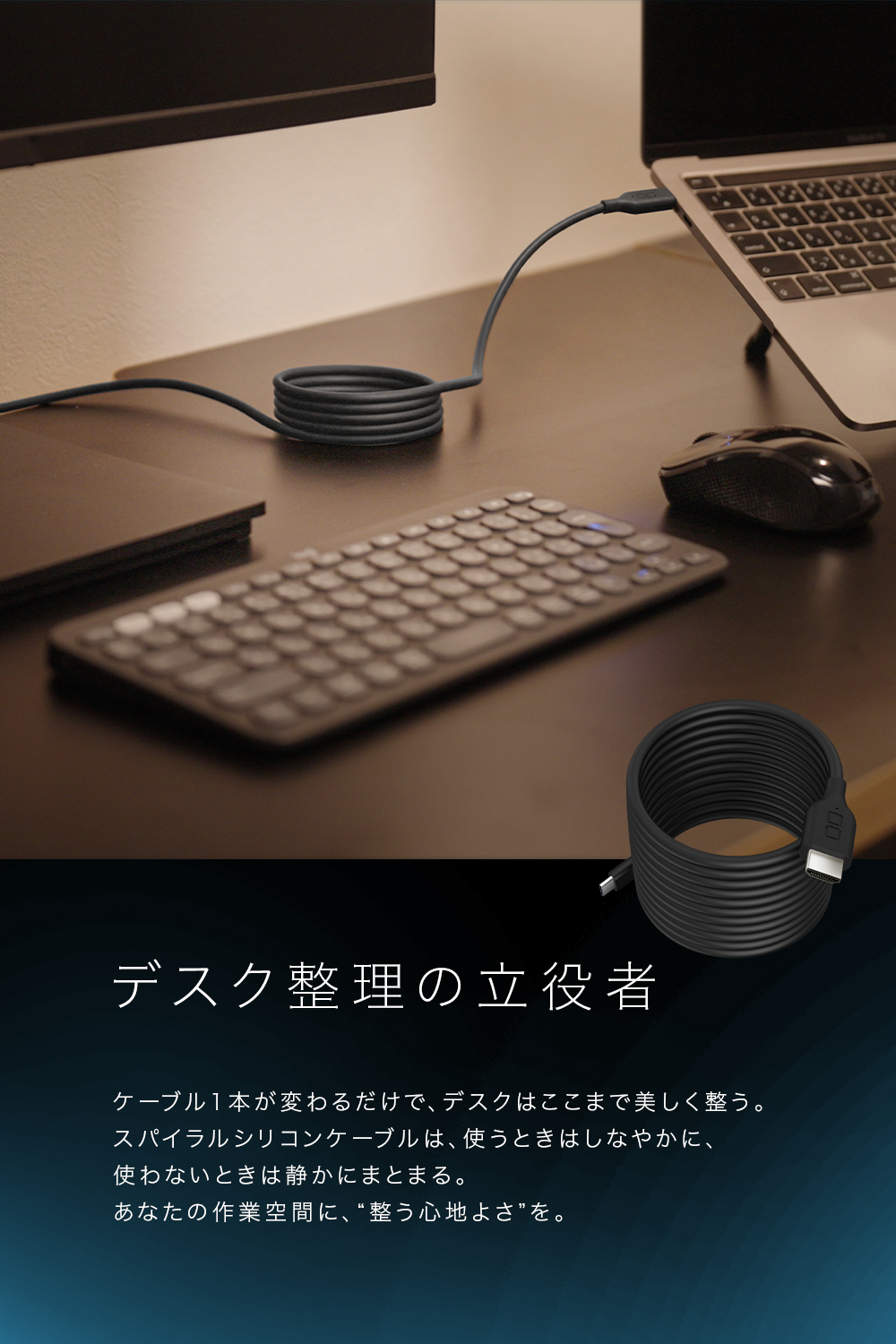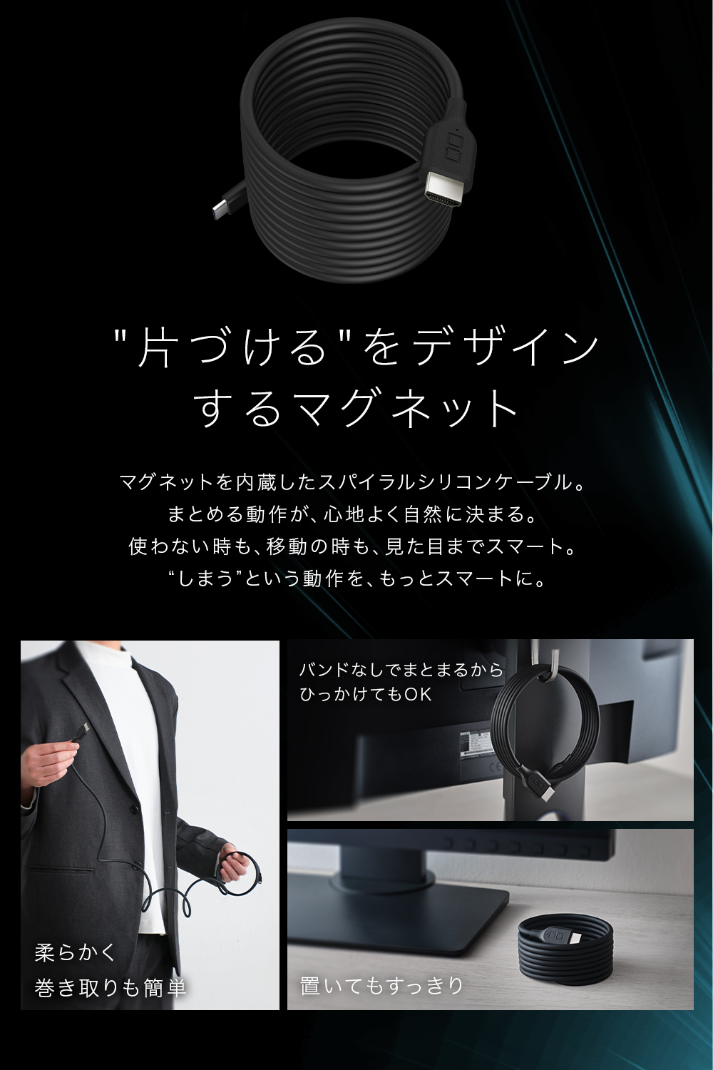 ケーブルに内蔵した磁石の力で、ケーブル同士がくっついて、コイルケーブルのようにスパイラル状にきれいにまとまります。2mの長さがありますが、余分なケーブルが気になったら、くるっと巻くことで、お好きな長さで使えます。ケーブルの収まりがよいだけでなく、使わない時の整頓性や、片付けが劇的に楽になります。