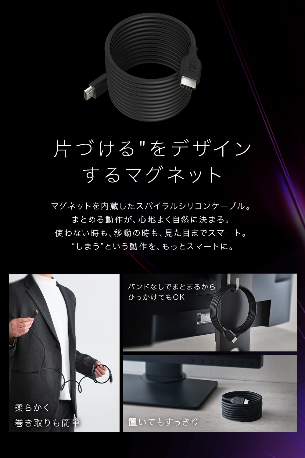 ケーブルに内蔵した磁石の力で、ケーブル同士がくっついて、コイルケーブルのようにスパイラル状にきれいにまとまります。2mの長さがありますが、余分なケーブルが気になったら、くるっと巻くことで、お好きな長さで使えます。ケーブルの収まりがよいだけでなく、使わない時の整頓性や、片付けが劇的に楽になります。