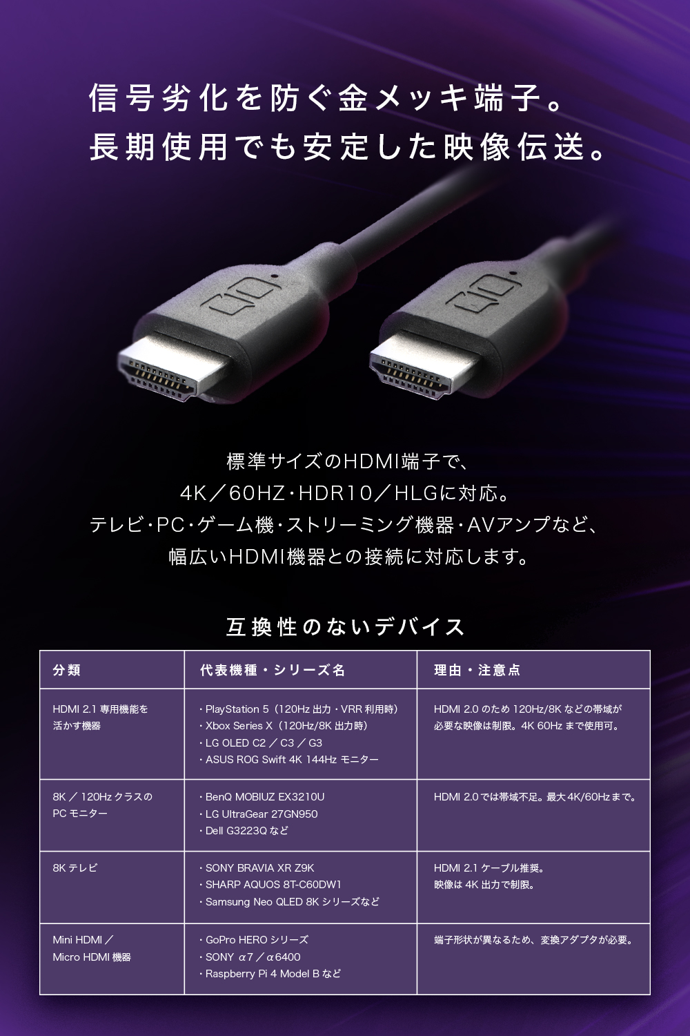 最大で4K60Hz(2K120Hz)の映像表示に対応します。また最大18Gbpsのデータ転送に対応しており、マルチチャンネルオーディオやHDRも使用可能。著作権保護信号を含む映像・音声伝達にも対応しています。HDMI端子を持つ機器同士をつなぐことで、4K放送やストリーミングビデオ、ゲームを楽しんだり、PCと繋いで作業やプレゼンテーションにお使いいただけます。