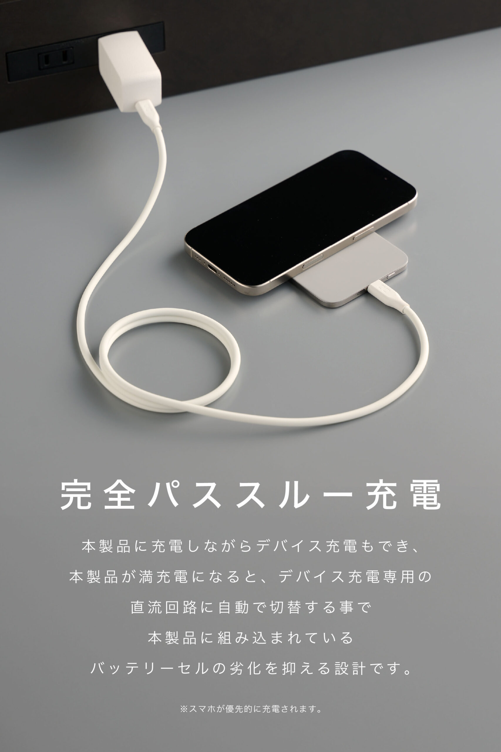 モバイルバッテリー本体を充電しながら、iPhoneなどの端末を同時に充電できる完全パススルー充電に対応。